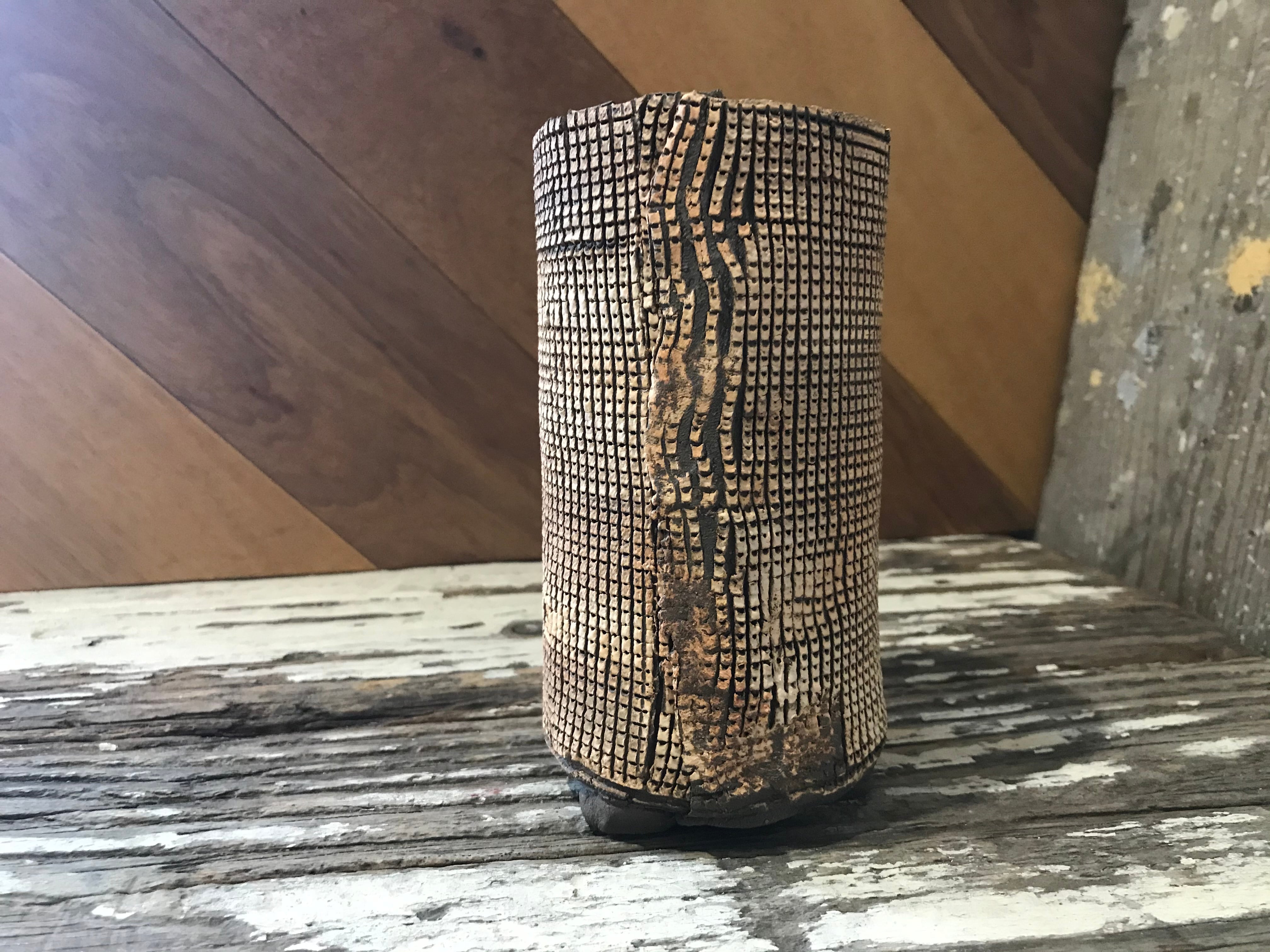 こちらは新作。表面に施された細かな模様が特徴的な作品です。釉薬を使わずに焼き上げた焼き〆タイプで、土の持つひびという表情を前面に表現する製作方法がとられた作品。ひびをあえて表情とすることで、他にはない独特のデザインが生まれています。鉢底に3本の足と水抜きの穴があるので、植物をそのまま植え込んでいただけます。