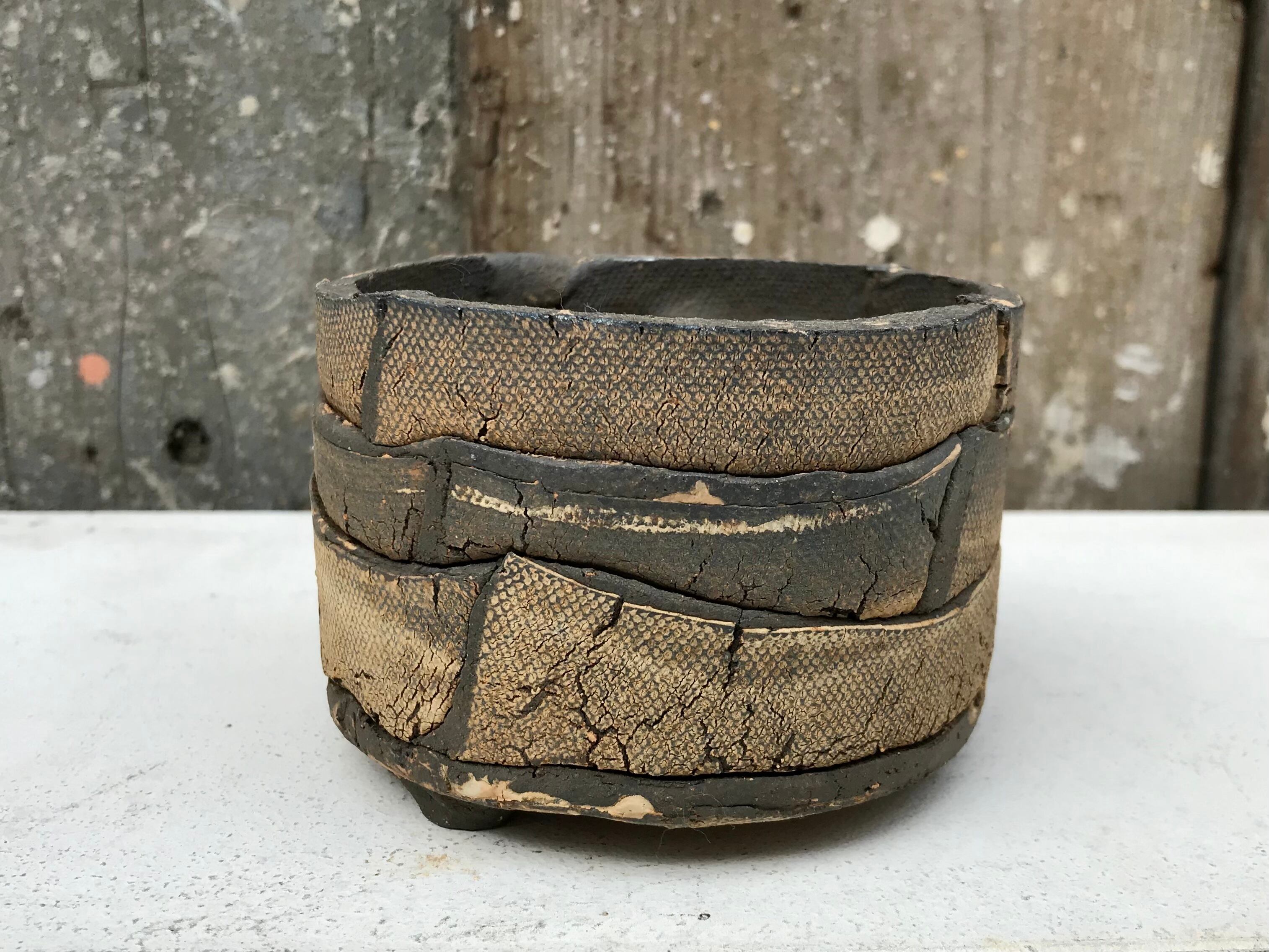 こちらは釉薬を使わずに焼き上げた焼き〆タイプで、土の持つひびという表情を前面に表現する製作方法がとられた作品。